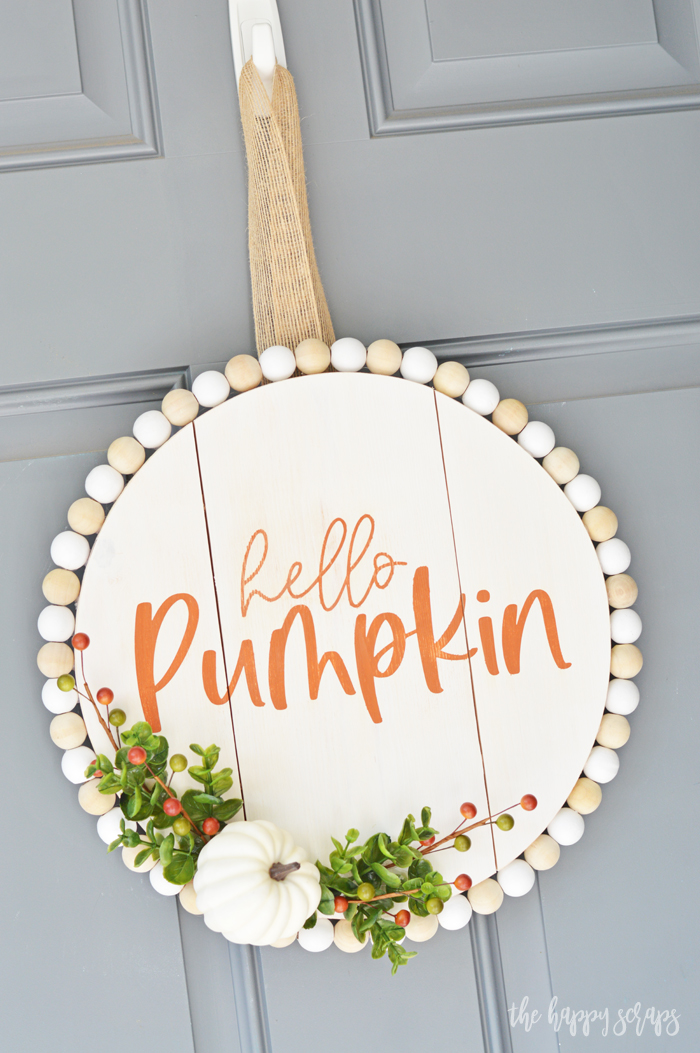 Decorate a wood blank circle with beads, fall florals, a mini pumpkin, and the words "hello pumpkin". See how to make this fall door decor...