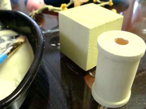 So then I painted this spool & block the Easter colors & used the left over Easter floral s & eggs along with jewels. Your probably thinking, what? Hold on let me show you it all together for a simple little table top decor.