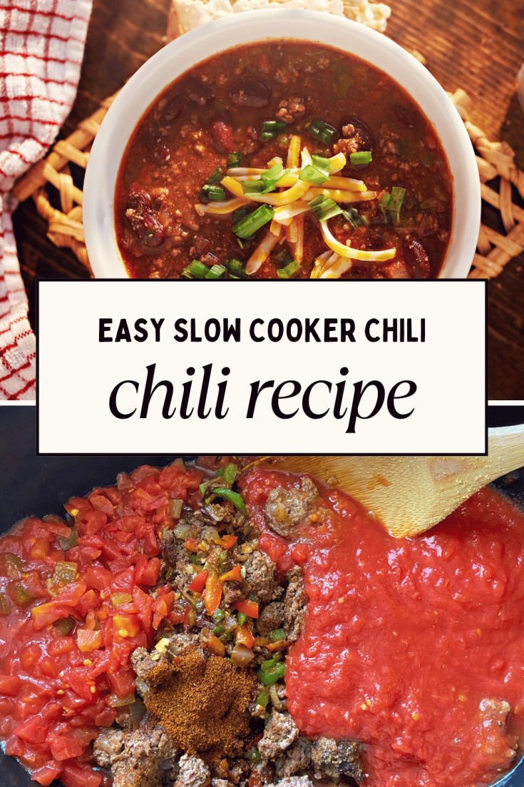 Are you looking for the ultimate cozy comfort food? Then make this hearty slow-cooker chili recipe! It is perfect for chilly evenings, cooking dinner in the fall or winter, football Sundays, or anytime you need a hands-off, flavorful meal. This slow-cooker chili is packed with meat and beans and is full of deep flavors, making it truly the best chili base for all your favorite toppings. It’s easy to make, and the clean-up is minimal!