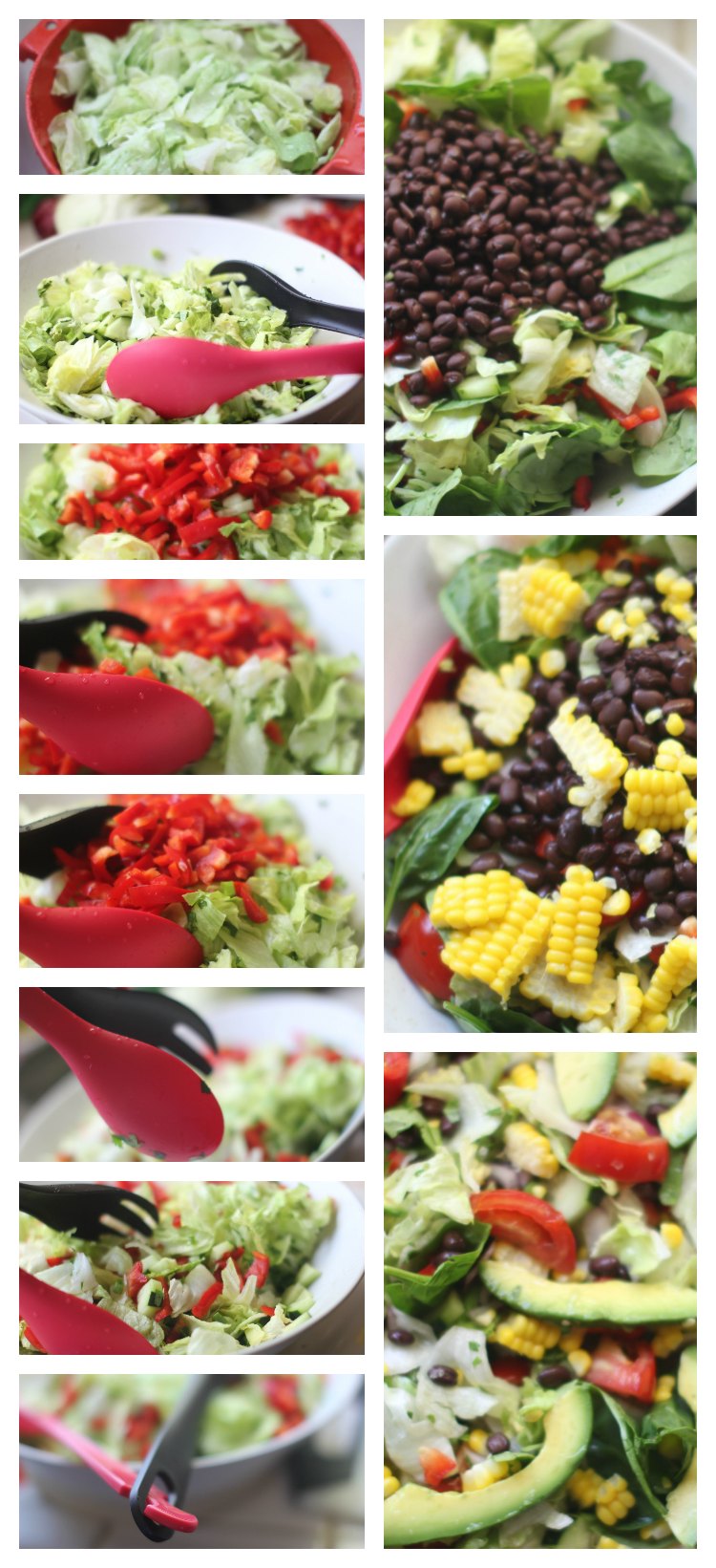 - This healthy salad recipe uses fresh corn, lettuce, black beans, avocado, tomatoes, and purple onion… This is super easy to make and probably really quick if you are not taking photos. lol, Give yourself about 30 minutes to prep the salad. I occasionally pull out my Vidalia Chopper
